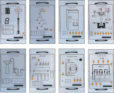 演示裝置上對PLC的輸入輸出均采用24V電源,5V電源供執(zhí)行機(jī)構(gòu)中的外圍使用,每套演示裝置主要由十七塊實(shí)驗(yàn)掛箱組成,它們的型號分別為: