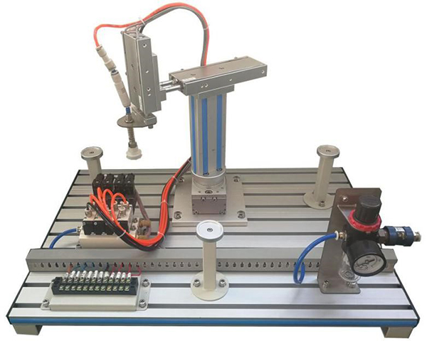 模型由回轉(zhuǎn)氣缸、雙軸氣缸、單軸氣缸、吸盤(pán)、真空發(fā)生器、電磁閥、節(jié)流閥、手滑閥、減壓閥、磁性開(kāi)關(guān)、機(jī)械部件、工業(yè)鋁合金型材底板等組成,設(shè)有兩個(gè)抓取工位,可進(jìn)行工件取放控制練習(xí)。可開(kāi)展對(duì)氣動(dòng)機(jī)械手的操作及編程控制訓(xùn)練。配有空氣壓縮機(jī):靜音無(wú)油,工作電源AC220V±10% 50Hz,輸入功率0.68kW;公稱(chēng)容積24L,理論流量:116L/min,額定輸出氣壓0.7MPa。