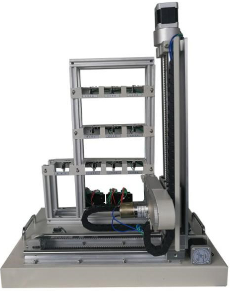 模型包含三層九倉(cāng)位庫(kù)體、出/入庫(kù)倉(cāng)位庫(kù)體、三維(X、Y、Z)運(yùn)動(dòng)機(jī)械及電氣控制等部分組成;定位執(zhí)行機(jī)構(gòu)由豎軸和橫軸組成;驅(qū)動(dòng)機(jī)構(gòu)由步進(jìn)電機(jī)及步進(jìn)電機(jī)驅(qū)動(dòng)器組成;傳動(dòng)軸為滾珠絲桿傳動(dòng)和雙軸導(dǎo)軌帶傳動(dòng),傳動(dòng)平穩(wěn)。取物軸由直流減速電機(jī)驅(qū)動(dòng),可實(shí)現(xiàn)前后兩方向的運(yùn)動(dòng)。 |