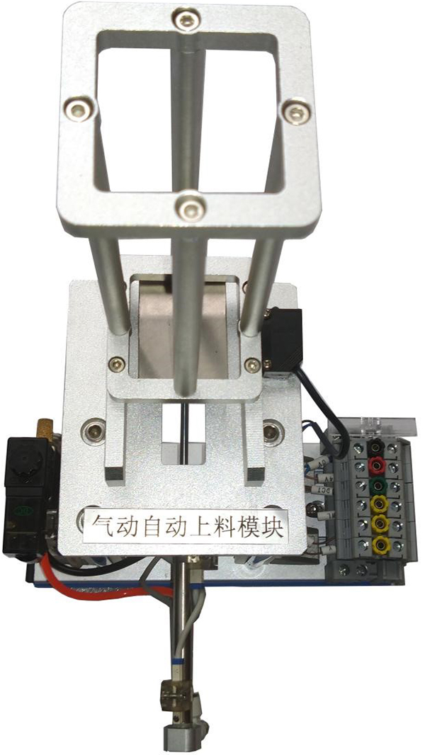 (2)系統(tǒng)由按鈕模塊、氣動(dòng)自動(dòng)上料模塊、傳輸線模塊和物料檢測(cè)及分揀模塊和輔助器件等組成。