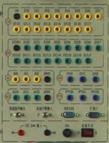 提供6路輸入、6路輸出等接口,輸入、輸出端電壓可自由切換0V和24V,輸出端由指示燈的亮滅來(lái)指示PLC輸出口的狀態(tài),面板印有清晰的說(shuō)明和端口絲印。通過(guò)基本指令練習(xí),讓學(xué)生掌握PLC輸入、輸出的外圍接線和工作原理。