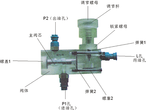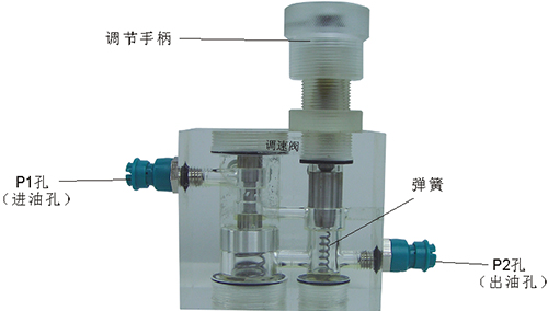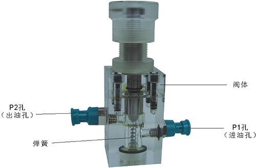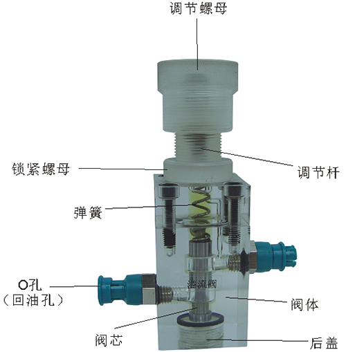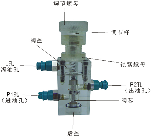 2、溢流閥結構上參考了國產(chǎn)P-63B型低壓直動式溢流閥,其閥體閥蓋、鎖緊螺母、調(diào)節(jié)螺母、螺塞等采用了進口透明有機玻璃材料精制而成,閥芯、調(diào)節(jié)桿采用了45#中碳鋼材料。并配合彈簧,油接頭,密封圈等標準件裝配而成,通過它可明確地觀察到閥芯、彈簧、油孔等結構及其運行過程,具有形象逼真,性能可靠等優(yōu)點。它即可作為教學模型,也可以作為液壓實驗元件進行實驗演示。