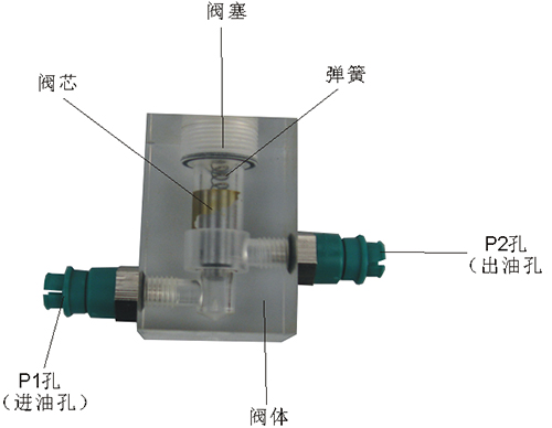 2、單向閥結構上參考了國產(chǎn)I--63B型板式單向閥,其閥體,螺塞等采用了進口透明有機玻璃材料精制而成,閥芯采用了45#中碳鋼材料,并配合彈簧,油接頭,密封圈等標準件裝配而成,通過它可明確地觀察到活塞、彈簧、油孔等結構及其運行過程,具有形象逼真,性能可靠等優(yōu)點。它即可作為教學模型,也可以作為液壓實驗元件進行實驗演示。