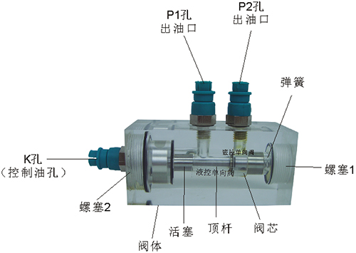 2、液控單向閥結構上參考了國產(chǎn)IY-25B型液壓單向閥,其閥體、螺塞等采用了進口透明有機玻璃材料精制而成,閥芯、頂桿采用了45#中碳鋼材料,并配合彈簧,油接頭,密封圈等標準件裝配而成,通過它可明確地觀察到活塞、彈簧、油孔等結構及其運行過程,具有形象逼真,性能可靠等優(yōu)點。它即可作為教學模型,也可以作為液壓實驗元件進行實驗演示。
