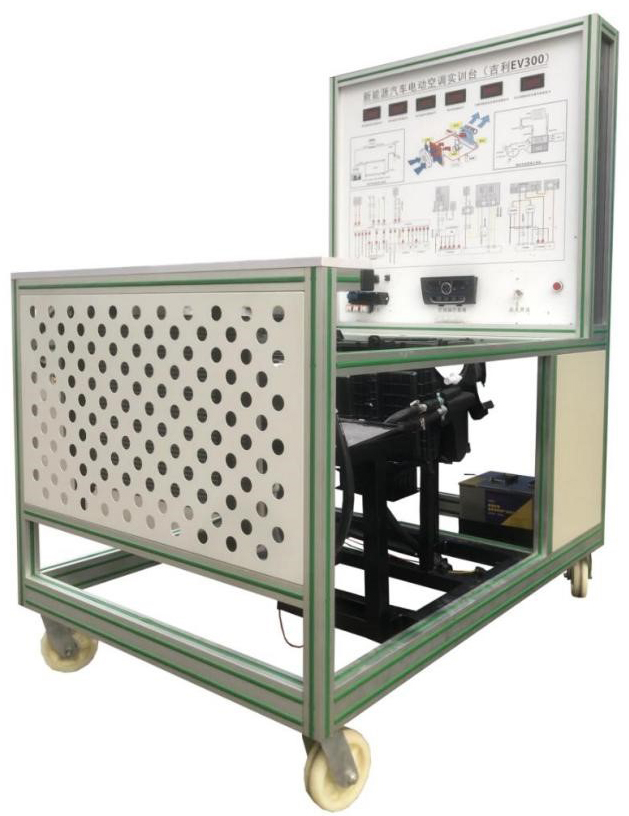 點(diǎn)火開關(guān)、電動汽車空調(diào)壓縮機(jī)、膨脹閥總成、干燥器總成、鼓風(fēng)機(jī)總成、冷凝器、冷卻電子風(fēng)扇、電動空調(diào)壓縮機(jī)控制器總成、空調(diào)蒸發(fā)箱總成、充電器與充電接口、充電插線、DC-DC轉(zhuǎn)換器、鋰電池組、空調(diào)操作面板、高低壓空調(diào)壓力表、采暖模塊總成、電源總開關(guān)、急停開關(guān)、直流接觸器、輔助蓄電池(12V45AH)、一體化全鋁合金型材搭建的移動臺架(1500×1000×1700mm ,帶自鎖腳輪裝置,帶安裝檢測端子的原理面板948×898mm)、故障模擬與排除裝置、設(shè)備操作說明書。