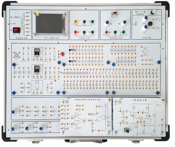創(chuàng)新型模塊化模擬電路實(shí)驗(yàn)箱由全鋁合金箱體、高性能線性電源和實(shí)驗(yàn)電路板組成。其中實(shí)驗(yàn)電路既可以采用固定功能模塊方式,也可以自行搭建實(shí)驗(yàn)電路,電路原理和元器件符號清晰,實(shí)驗(yàn)用元器件全部焊裝在線路板的反面,安全可靠,不易損壞。本實(shí)驗(yàn)箱適用于本專院校所有電類和非電類專業(yè)《模擬電子技術(shù)》、《電子線路》等課程的實(shí)驗(yàn)教學(xué)。