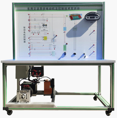 檢測(cè)控制面板(裝有各種檢測(cè)端子,1448×940mm彩色電路圖和工作原理示意圖)、組合儀表、點(diǎn)火開(kāi)關(guān)、電機(jī)控制器、車載充電器與充電接口、DC-DC轉(zhuǎn)換器、鋰動(dòng)力電池組、電動(dòng)車電機(jī)(交流異步電動(dòng)機(jī))、剎車開(kāi)關(guān)、檔位開(kāi)關(guān)、油門控制裝置、大電流繼電器、電源總開(kāi)關(guān)、急停開(kāi)關(guān)、輔助蓄電池(12V45AH)、一體化全鋁合金型材搭建的移動(dòng)臺(tái)架(1500×700×1700mm (帶自鎖腳輪裝置,帶安裝檢測(cè)端子的原理面板,面板1448×940mm)、設(shè)備操作說(shuō)明書(shū)。