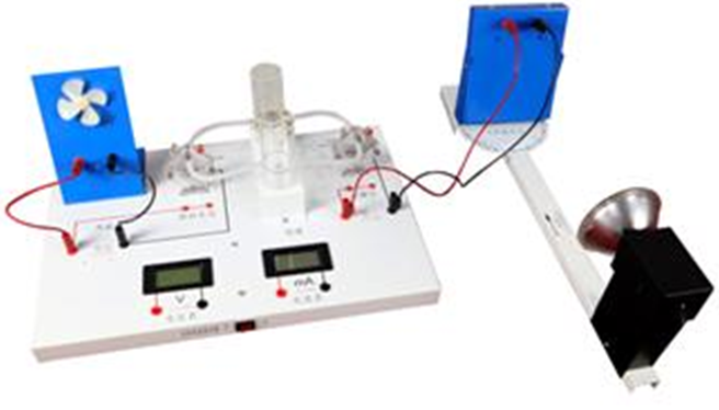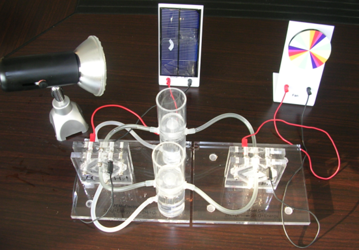 燃料電池教具是利用光線照射在太陽(yáng)能電池板上產(chǎn)生電能,然后利用產(chǎn)生的電能作用在電解電池模塊上,使水發(fā)生電解產(chǎn)生氫氣和氧氣。氫氣和氧氣進(jìn)入到發(fā)電模塊產(chǎn)生電能,帶動(dòng)風(fēng)扇轉(zhuǎn)動(dòng)。