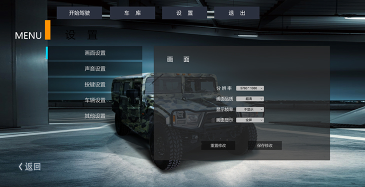 7.2、汽車(chē)設(shè)置界面:調(diào)整車(chē)輛各項(xiàng)動(dòng)力學(xué)參數(shù)、車(chē)輛后視鏡及視角調(diào)整。