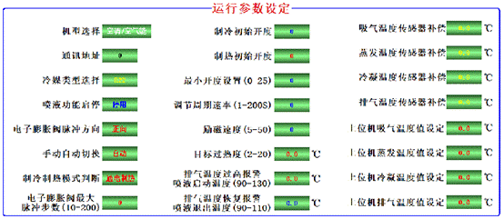 路參數(shù)控制參數(shù)設(shè)置/查詢(xún):控制器內(nèi)所有與控制相關(guān)的溫度參數(shù)、時(shí)間參數(shù)、控制參數(shù)、等29個(gè)參數(shù)都可以調(diào)整,以適應(yīng)制冷/熱泵/冷庫(kù)/水機(jī)等設(shè)備。