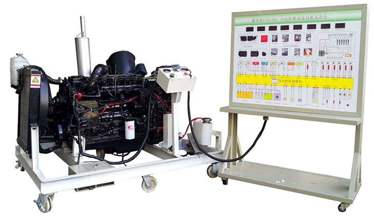 柴油發(fā)動機總成、組合儀表、發(fā)動機控制單元、散熱系統(tǒng)(水箱、風扇、上下水管)、排氣系統(tǒng)、進氣系統(tǒng)(進氣軟管、空氣濾清器總成)、原車電路原理圖板及檢測端子面板、蓄電池、電源總開關、燃油箱、油水分離器、油門踏板裝置、可移動機臺架、臺架高溫及轉動等部位加裝防護裝置等。