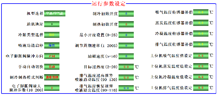 11)、顯示界面上29 路參數(shù)控制參數(shù)設(shè)置/查詢(xún):控制器內(nèi)所有與控制相關(guān)的溫度參數(shù)、時(shí)間參數(shù)、控制參數(shù)、等29個(gè)參數(shù)都可以調(diào)整,以適應(yīng)制冷/熱泵/冷庫(kù)/水機(jī)等設(shè)備。