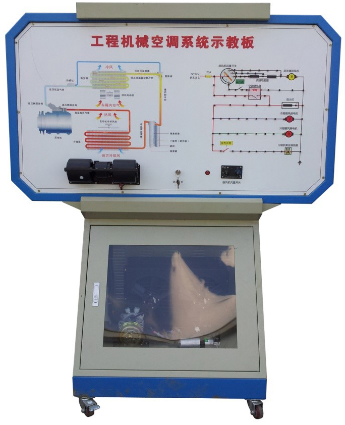2.由三相電機做為動力源,帶動空調(diào)壓縮機工作。操作空調(diào)控制面板,可真實演示車輛空調(diào)系統(tǒng)的工作過程以及工作原理。